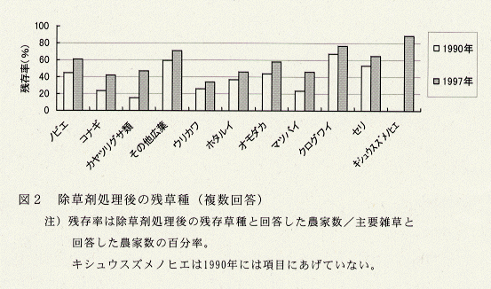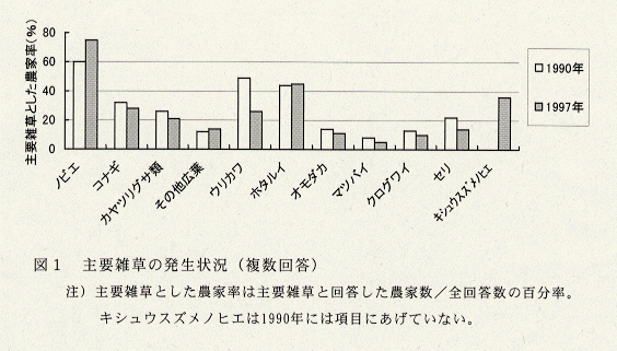 - 本県に発生する主要雑草はノビエ、ホタルイ、キシュウスズメノヒエ等である。前回1990年の調査に比べて、ノビエが増加し、ウリカワが減少している(図1)。