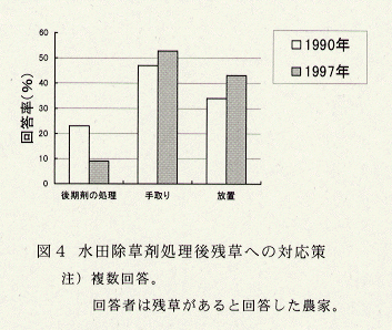 - 除草剤処理後の残草に対する対応策として「手取り」が最も多い。前回の調査に比べて「放置」の回答が9ポイント上昇し、「後期剤の処理」の回答が大幅に減少している(図4)。