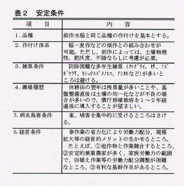 - 必要条件を満たす地域内で、圃場条件等の違いによる導入の難易度および注意事項を安定条件として示した(表2)。