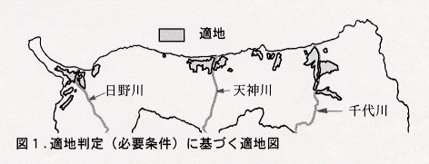 - 設定した必要条件から、鳥取県における不耕起乾田直播栽培の適地図を作成した。この結果、栽培適地と判断された地域は、県内3大河川(日野川、天神川、千代川)下流の平野に集中し、適地面積は7,700haであった(図1)。