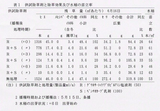 - 冬雑草を対象とする播種前の除草剤散布を省略し、播種後~水稲の出芽始めまでに、非選択性の茎葉処理剤とベンチオカ-ブ等の土壌処理剤の同時処理を行うことにより、水稲に対する薬害もなく、既生雑草の防除と播種後の初期除草をあわせ行うことが可能である(表1)。その後に発生する雑草に対して、シハロホップブチルもしくは必要に応じてベンタゾン等を加えて処理を行う。