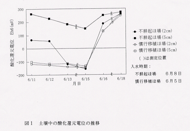 - 約1ヶ月後の入水により、前作の稲わらに加えて冬雑草の残さが分解し始めるが、土中の還元程度は耕起栽培より少なく(図1)、水稲は既に4~5葉期に達しており、水稲に対する影響はほとんど認められない。