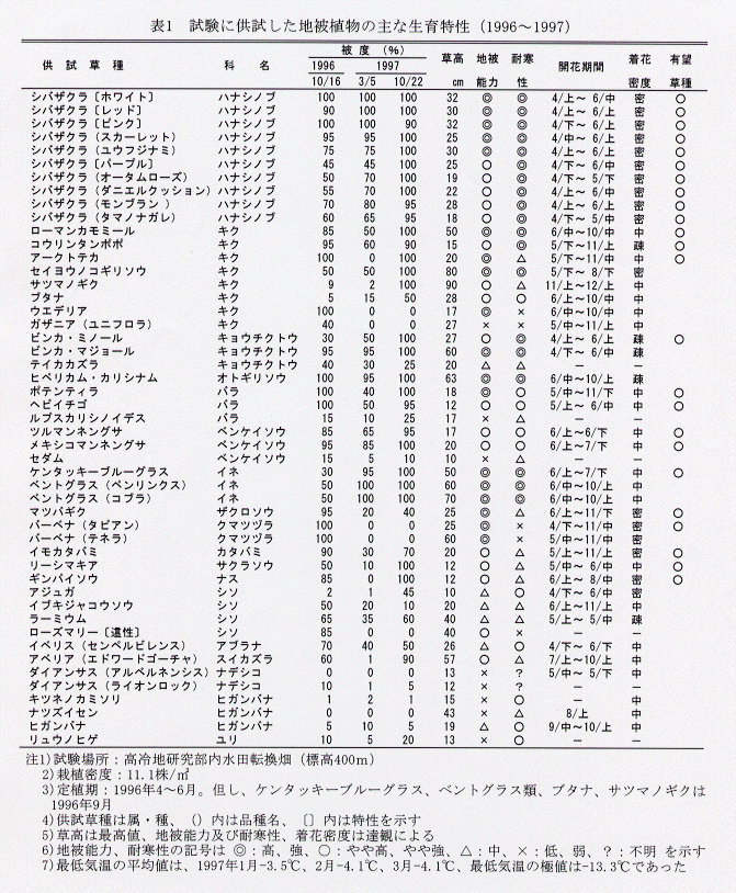 - 夏から秋にかけて被度が高く、越冬後の被度が50%以上の草種は、シバザクラ類、ローマンカモミール、ビンカ・ミノール、コウリンタンポポ、ヘビイチゴ、ツルマンネングサ、メキシコマンネングサ、ケンタッキーブルーグラスの17種である(表1)。