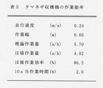 - 作業能率は0.24m/sの作業速度における理論作業量は5.7a/h、ほ場作業量は4.9a/h、ほ場作業効率は86%となる。10a当たり作業時間は2.0時間となり、人力収穫の10.5時間と比べると約5倍の能率になる(表2)。