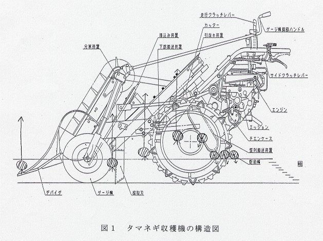 - 開発機は歩行型2条の小型・軽量のタマネギ収穫機である。掘取り・剪葉・球の整列を一工程で行うことができ、剪葉長は4~20cmまで無段階に調節できる。輪距は1,170~1,370mmに調節でき、運搬時は軽四トラックに積載可能である。