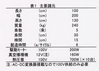 - 本機は、再生紙マルチシートに孔をあける機構(円筒刃による打ち抜き)、ホットメルトを塗布した2枚の不織布の間に種籾4粒を封入する機構(真空播種機による種籾送り、アイロンによる熱圧着)、籾袋をベースに貼り付ける機構(アイロンによる熱圧着)、そしてこれらを駆動する機構(モータとクラッチによる間欠駆動、直動支持)で構成される(図1)。動力源は100Vで約10kW必要(表1)。