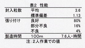 - 本機の精度は籾の封入粒数が平均3.6粒、張り付けが良好なものは80%で部分的に張り付け不良になったものが16%である(表2)。