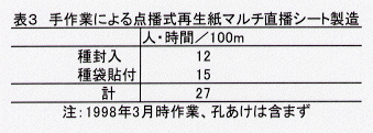 - 本機は100mの点播式再生紙マルチ直播シートを2人組作業において4時間弱で製造でき,手作業時の27人・時間から大幅に省力化する(表2、表3)。