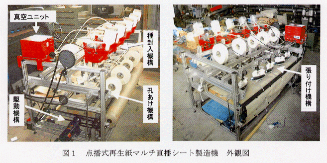- 本機は再生紙マルチの孔あけ機構、種籾の封入機構、籾袋の貼り付け機構、及び駆動機構から構成され、再生紙マルチ直播による水稲点播栽培で使用する点播式再生紙マルチ直播シートを製造できる。