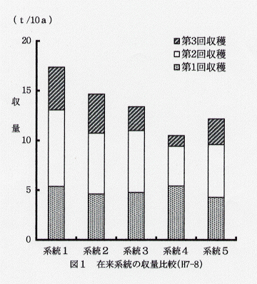 - 府内4市町のフキ生産出荷部会から推薦された在来系統を、平成7~8年の2ヶ年、現地試験ほ場(泉南市)でハウス抑制栽培し、収量性に優れた系統1を選抜した(図1)。