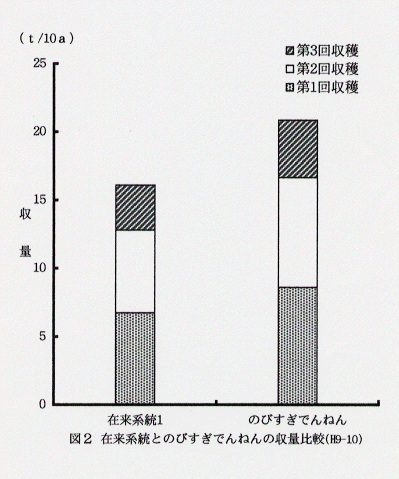 - 選抜した5系統と系統1を現地試験ほ場(泉南市)に定植し、平成9~10年の2ヶ年、慣行のハウス抑制栽培を行った。年3回の収量調査を行い、収量性に優れた系統「のびすぎでんねん」を選抜した。本系統の収量特性は以下の通りである。