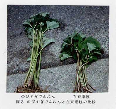 - フキ在来系統の系統選抜と培養過程における試験管内選抜を行い、葉柄の緑色が鮮やかで、みずみずしく、歯切れが良く、秀品率向上と収量増加が認められる優良系統「のびすぎでんねん」を育成した。