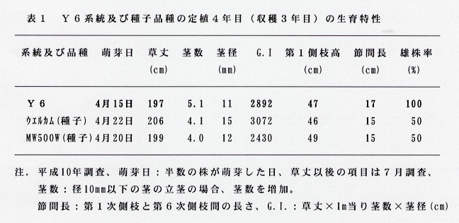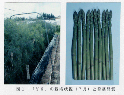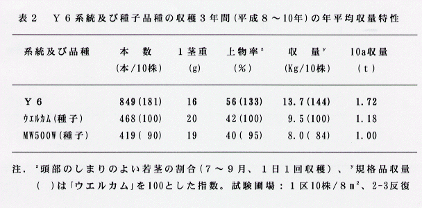 - 平成8~10年の3ヶ年、露地での慣行の全期立茎栽培法により4~9月の間、収穫調査を実施し、優良な雄株系統として「ウエルカム」由来の「Y6」を選抜した。