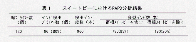 - スイ-トピーの栽培品種は、開花時期、花色、性状が豊富な自殖一年性植物であり、遺伝的に固定している。DNAマーカーを作出する場合、両親間で多型を示すバンドが必要である。そこで、品種間多型バンドの検出と品種間の遺伝的な近縁関係を調査することにより、品種分類の可能性を検討する。