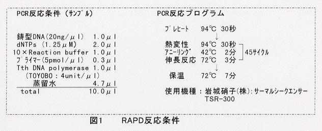 - RAPD法では12塩基のDNAオリゴマーセット(和光純薬)のセットA,Eを使用し、PCR反応は図1の通り行った。PCR産物は、1.5%アガロースゲル電気泳動で分離し、品種間の多型バンドを検出した。バンドの有無に基づき、品種の類似比を指標に平均距離法(UPGMA法)より遺伝的距離を計測した。