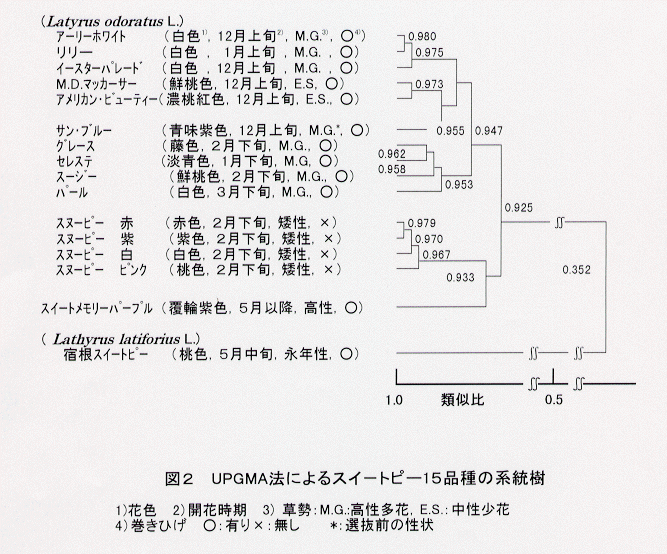 - 宿根スイ-トピー(Lathyrus latiforius L.)は、栽培品種(Lathyrus odoratus L.)と同属ではあるが、遺伝的に遠く、栽培品種との交配が難しいことと一致する(図2)。