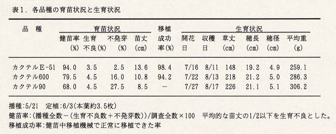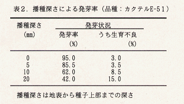 - 育苗資材としてY社製200穴セルトレイと育苗用土の与作V-150使用、ミスト潅水(1日2回各3分間)で管理する。適用品種はカクテルE-51が発芽率、健苗率が良く用い(表1)、種子が見えるか見えない程度の深さに覆土することにより、播種数の90%以上の苗が得られる(表2)。
