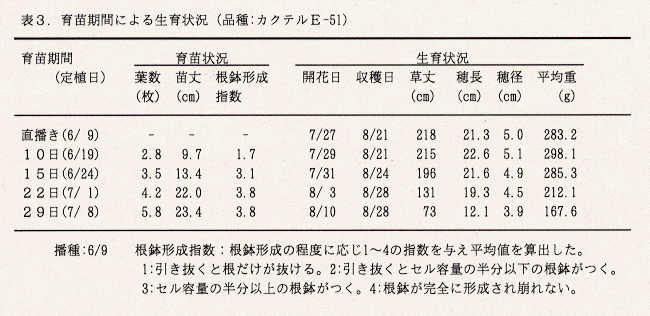 - 15日間育苗し、1条植え自動移植機で定植すると98%は正常に移植でき、直播きと同程度の収量が得られる(表3)。これより育苗期間が短いと根鉢形成が不十分で機械移植できない。育苗期間が長すぎると移植後の生育が不良で十分な収量が得られない。