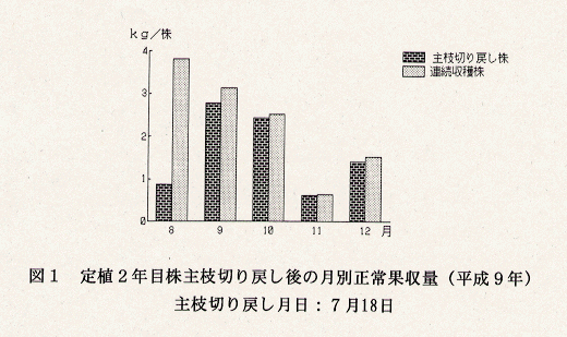- 本方式で周年の連続収穫が可能となるが、据置栽培によって整枝・整芽労力が増加する。その対策として、7月下旬に最下側枝を残して切り戻す夏季主枝切り戻し方式を行なうと、8月の収量は連続収穫した場合の約2割になる、9月には9割程度に回復し、その後は、ほぼ同等に推移する(図1)。