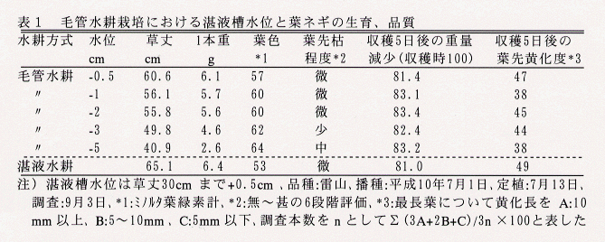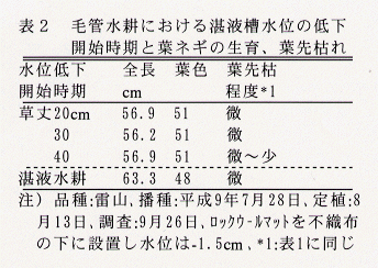 - 水位低下開始時期が草丈20~40cmの範囲では、葉ネギの生育、品質は差が小さい。生育後半の葉先枯れは、水位低下を草丈20~30cmから開始すると湛液水耕と同程度に少なくなる(表2)。