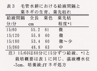 - 培養液の供給を60分~120分間隔に15分とすると、生育の抑制、葉先枯れの発生を少なくできる(表3)。