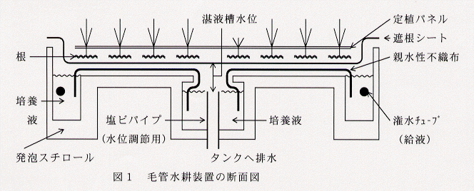 - 毛管水耕装置は、市販の花きカーネーション用を一部改良し、中央湛液槽上面の空き面積を少なくして栽植本数を増加させ、ベッドを水平にして生育を揃える。生育途中から湛液槽水位を下げ水分を制御する(図1)。