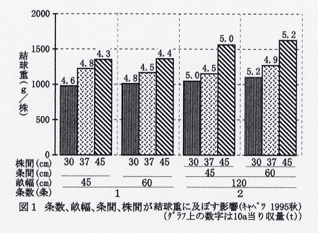- キャベツ、ハクサイならびにレタスの栽培に標準的栽培様式を適用すると、条数、畝幅、条間ならびに株間の中では、株間が最も生育に影響を及ぼし、株間が広いほど結球重が重くなる。しかし、標準的栽培様式の諸元の組み合わせにより、10a当り収量は低下することもある(図1)。