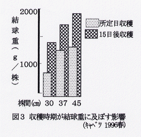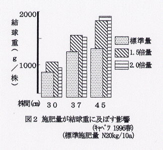 - 標準的栽培様式の下でのキャベツ、ハクサイならびにレタスの生育には、株間が大きく影響し、株間が広いほど結球重が重く、揃いが良くなる。狭い株間では増施と収穫時期延長により増収する。水田転換畑では畝高の影響が大きい。