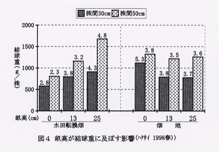 - 畝高の影響は、水田転換畑では大きく、畝高が高いほど結球重が重くなる。畑地では畝高の影響は認められない(図4)。