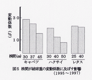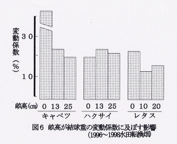 - 結球重の揃いは、株間が広いほど良くなるが、畝高の違いでは一定の傾向が認められない(図5、6)。