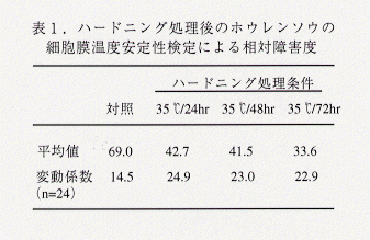 - 高温処理の温度は50℃、処理時間は30分が適当である。さらに植物体をハードニング処理することにより、その品種間差異が顕著になって耐暑性評価の精度が高まる。ハードニング処理条件は35℃、24時間程度が効果的である(表1)。