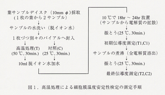 - 図1の手順によって葉ディスクサンプルを含む溶液の電気伝導度を測定し、以下の計算により細胞膜の相対障害度を求めて耐暑性の指標とする。