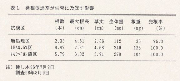 - 挿し木には、発根促進剤の利用効果が高い(表1)。
