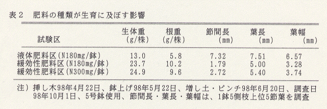 - 鉢上げ後の液体肥料の使用は、地上部の生育が旺盛になりすぎ日焼け症状が発生した。一方、緩効性肥料を用いると安定した生育となる(表2)。
