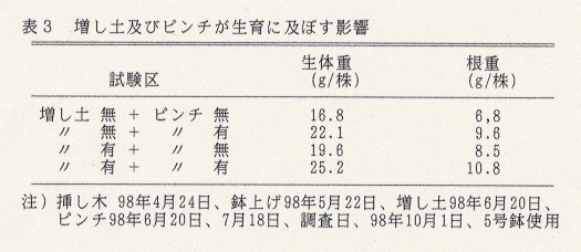 - 鉢上げ後の増し土及びピンチは、側枝からの発根と新枝の発生を促すため、鉢内の生育が旺盛になり、安定した生産が可能となる(表3)。