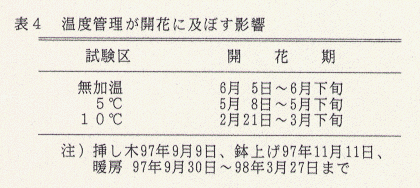 - 冬季加温(10℃)すると、開花時期を3カ月程度早めることができる(表4)。