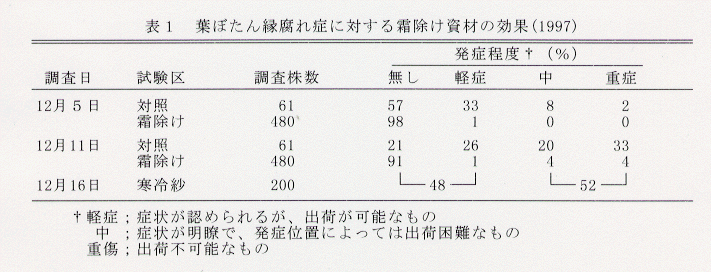 - 初霜前の11月23日からトンネル状に設置した支柱の上に長繊維不織布(カネボウ合繊製ラクトロン)を畝上50cmに浮き掛け被覆する「霜除け区」では、縁腐れ症の発生は9%にとどまった(表1)。