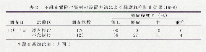 - 1998年、同じ不織布を用いて、設置方法の違いについて試験したところ、省力を目的とした「べた掛け」では発症防止効果がなかった(表2)。