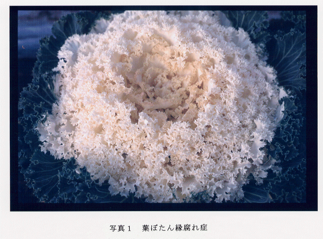 - 葉ぼたんにおいて、収穫期(12月上旬)が近づくにつれ、株の中心葉もしくは同心円状に葉縁からネクロシスを呈する症状(写真1)(以下、葉ぼたん縁腐れ症という)が発生することがある。本症状は葉縁にひだがあり、中心葉が白色の名古屋ちりめん系の白色品種に多く発生する。また、年により葉縁にひだのない大阪丸葉系やちりめん系の紅色品種でも発症する。