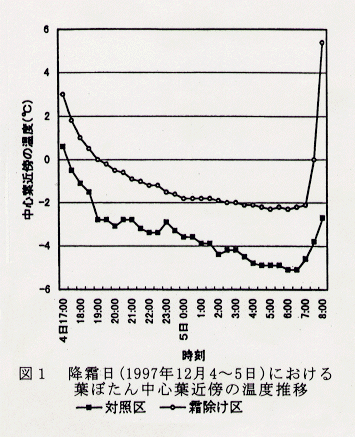 - 「対照区」と「霜除け区」において、中心葉付近の気温推移を測定したところ、降霜のある時間帯に葉面付近での温度差が広がっており(図1)、発症と温度の関連が示唆された。