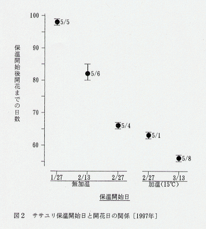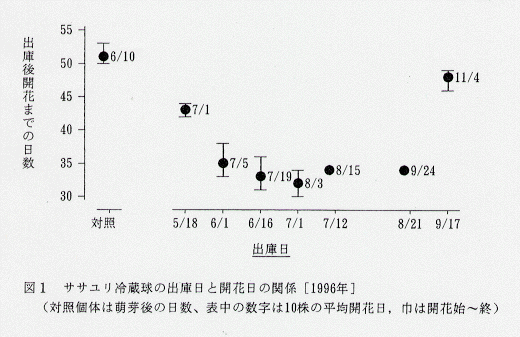 - 奈良県の平地では、ササユリは4月に萌芽し、51日後の6月10日前後に開花する。抑制開花を目指す場合は、5月中旬から6月上旬に冷蔵した球根を出庫し定植すると、開花までに35~43日を要し、7月上旬に開花する。6月中旬出庫では33日後の7月中旬に、7月上旬出庫では32日後の8月上旬に、7月中旬および8月下旬出庫では34日後の8月中旬と9月下旬に、9月中旬出庫では48日後の11月上旬にそれぞれ開花する(図1)。