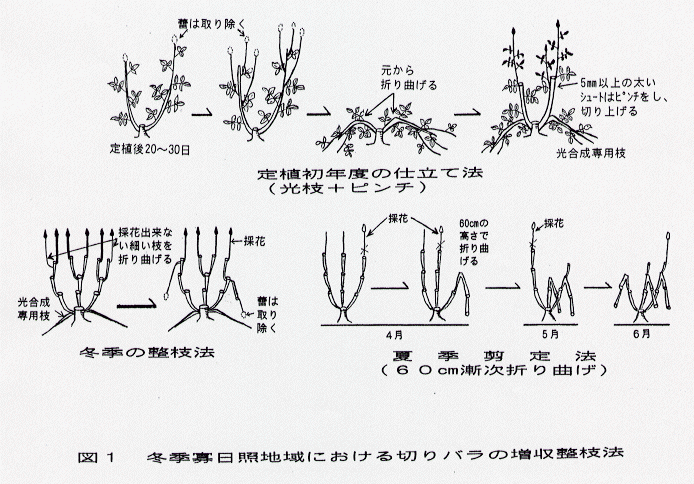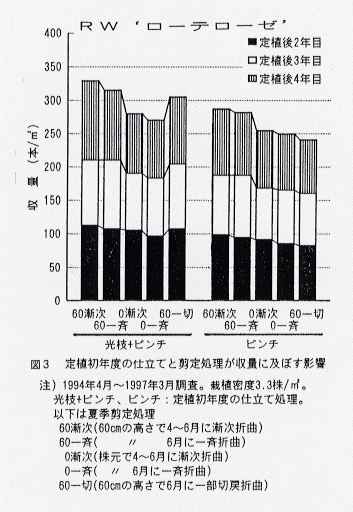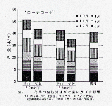 - 「夏季剪定法」:4~6月に3回に分けて採花の終わった母枝から順に、60㎝の高さで折り曲げる(図1)。この方法(60漸次区)は、検討した5処理の中で最も多くの収量が得られる(図3)。