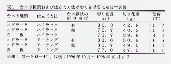 - 切り花長および切り花重は、オドラータ台木苗が自根苗よりも仕立て方法に関わらず大きい。また、台木の緑枝を折り曲げることによって、さらに大きくなる(表1)。