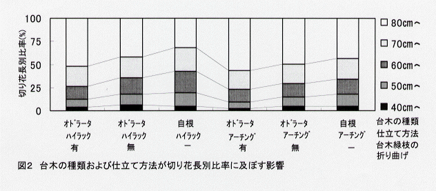 - 切り花長が80㎝以上の割合は、ハイラック仕立ては、オドラータ台木苗が自根苗よりも9%高い。また、オドラータ台木の緑枝を折り曲げることによって、自根苗より19%高くなる。アーチング仕立ての場合、それぞれ6%、13%高くなる(図2)。