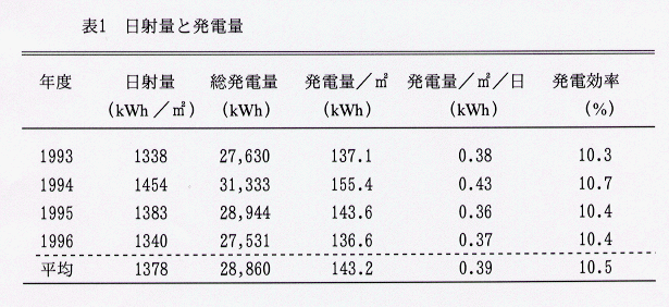 - 太陽電池による発電量は日射量と高い正の相関が認められ、日射量の約10%を電力に変換することができる。4年間平均の年間発電量は140kWh/㎡、1日当たりでは0.4kWh /㎡である。
