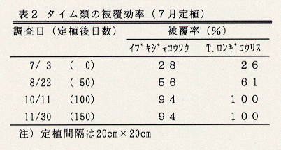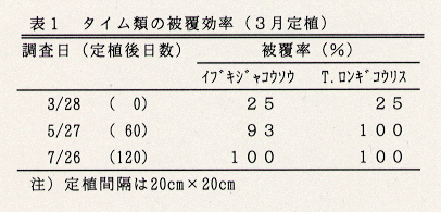 - イブキジャコウソウは匍匐性タイムの一種で、春~秋に植え付けが可能で、土壌改良資材の20%程度の土壌混合により早期に被覆率を高めることができる。また、5月の刈り込みで株生存率が高く、景観が良好となる。