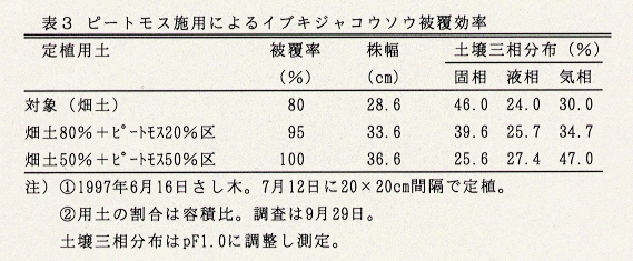 - 早期に被覆効率を高めるため、土壌改良資材としてピートモス(苦土石灰4g/リットルを添加)を混合し植え付けたところ、定植100日後にはピートモスを混合しない区で80%の被覆率に対し、ピートモス50%混合区で100%の被覆率が、20%混合区でも95%の被覆率となる(表3)。