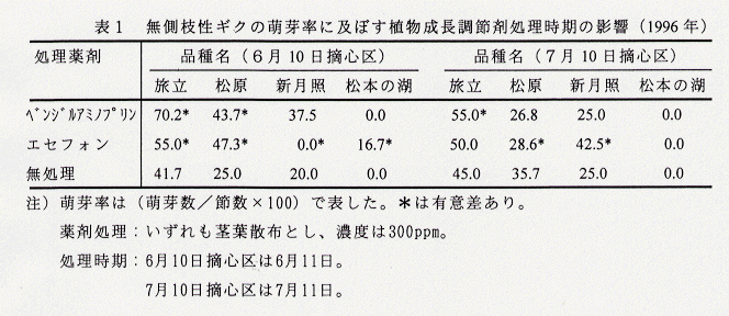 - 品種により、ベンジルアミノプリン処理及びエセフォン処理で萌芽率の向上がみられる。摘心及び処理時期の早いほうがベンジルアミノプリン処理効果は高い。エセフォン処理は品種により萌芽率を低下させる(表1)。