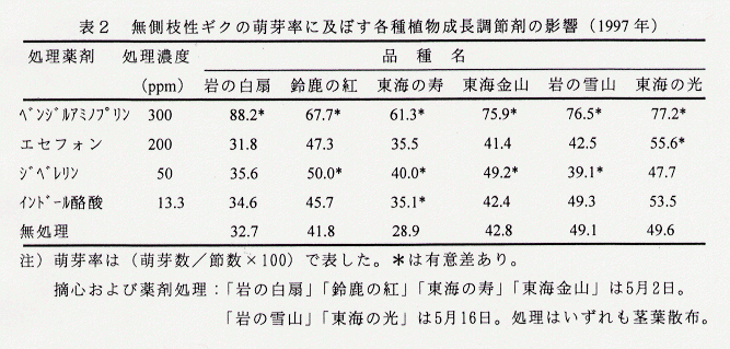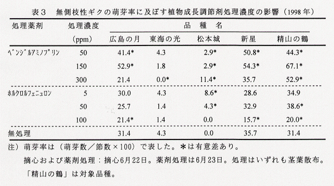 - サイトカイニン様合成剤であるホルクロルフェニュロンは、薬害が発生し効果がない。ベンジルアミノプリンの150ppm処理で、薬害もなく萌芽率が向上する(表3)。