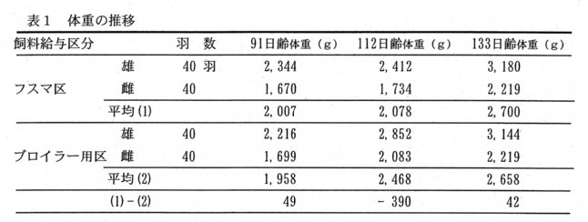 - 雄雌ともにフスマ給与期間中の増体は悪くなるが、113日齢からブロイラー飼料に戻すことにより発育が改善し133日齢ではブロイラー用飼料の成績と差はない(表1)。